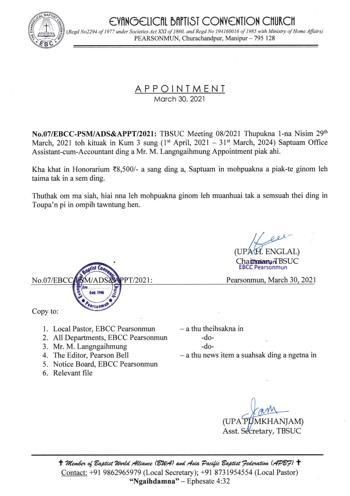 No.07GBCC-PSM/ADS&APPT/2021: TBSUC Meeting 08/2021 Thupukna 1-na Nisim 29th March, 2021 toh kituak in Kum 3 sung (1st April, 2021 — 3l St March, 2024) Saptuam Office Assistant-cum-Accountant ding a Mr. M. Langngaihmung Appointment piak ahi.