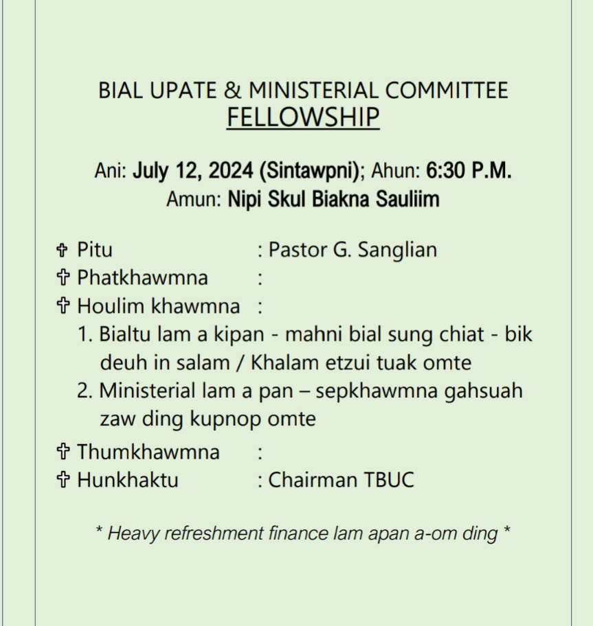 Tuni Nisim 12-07-2024 Nitak Dak 6:30 in Naupang Nipi Skul Biakna Sauliim ah Bial Upa leh Ministerial Committee in fellowship nei uhi. Tua hun ah Bial chih in report pia uh a, maban ah Bial sung mite lak ah nasep ding dan ahoih zaw ding omte kikum khawm uhi.