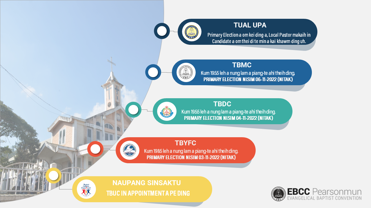A hong tungpah ding Nisim 20-11-2022 (Pathianni) Zing Biakna kikhop hun ah Department tuamtuam a ding a Committee ding kitelna om ding hi. Tua hun ah Primary Election hun a telching a omte a pat telkhiak sawn hilai ding hi.