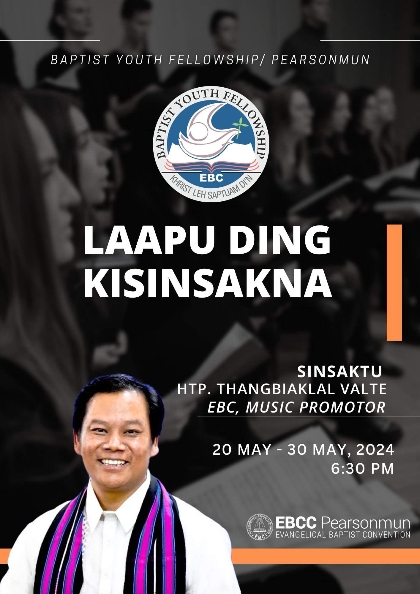 Tuailai pawl in Nisim 20-05-2024 Nitak in Laapu ding kisinsakna ana pan uhi, tua hun ah Sinsaktu in V. Thangbiaklal, Music Promotor, EBC pang a tuailai a tel tampitak in hamphat pih uhi. May 20 a apat uh May 31 nitak in azohna nei uhi.