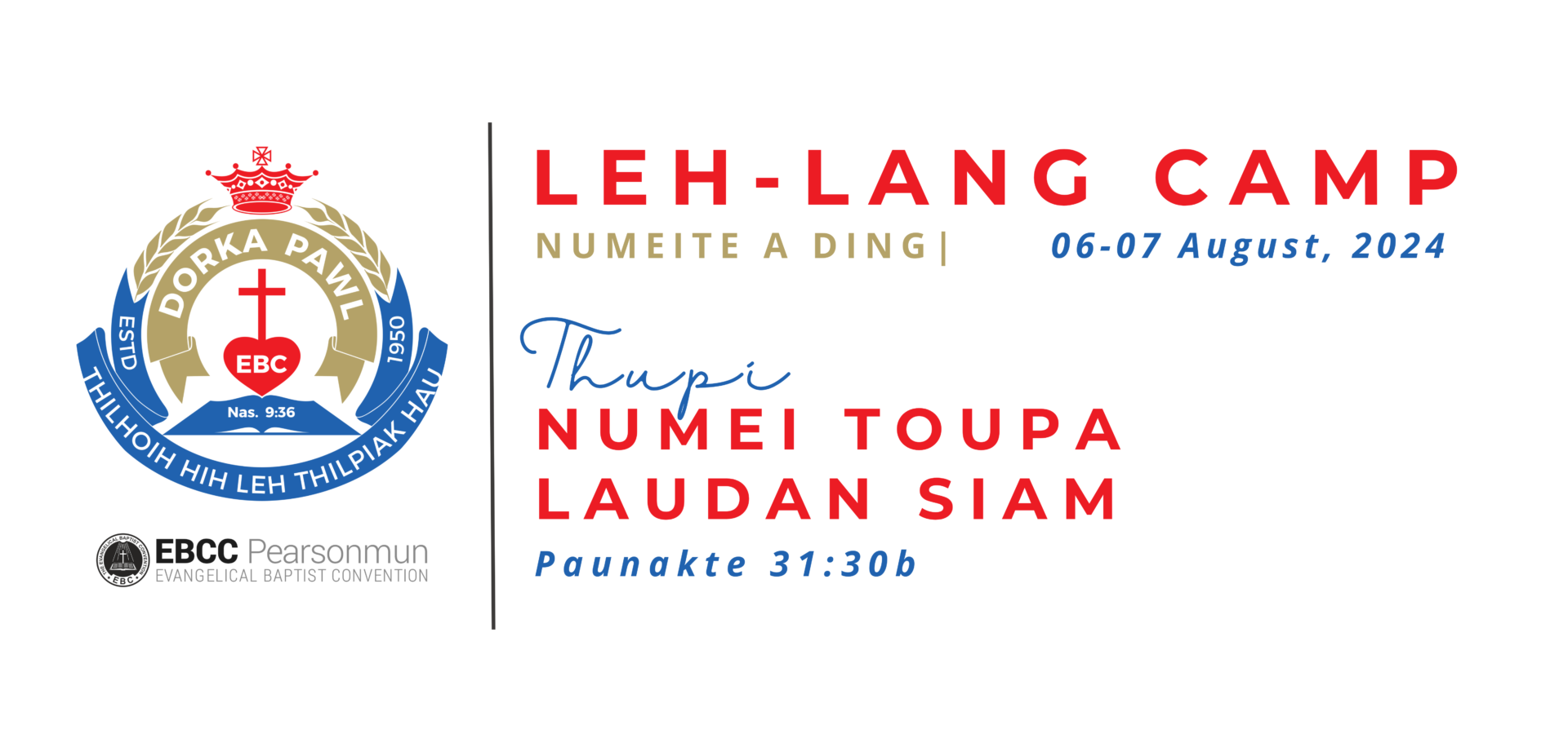 Numeite a ding in tuni zing Dak 10:30 in Biakinn ah Leh-Lang Camp kipan hi. Tua hun ah Thugentu in Dr. Niangsangching pang hi. Numeite a ding LEH-LANG CAMP Ni 6-7 August, 2024 sung hi ding ahi. Camp gahsuah ahihna ding in Thumna ah phawk chiatni.
