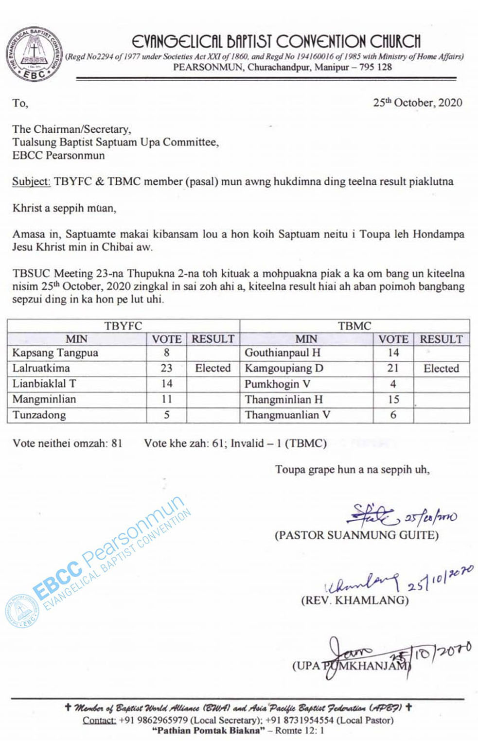 Nisim 25-10-2020 Zingkal 7:00 AM - 8:00 AM sung in Biakin ah Department Committee teng in teel na nei uhi. Tua hun ah telching a awm te.
